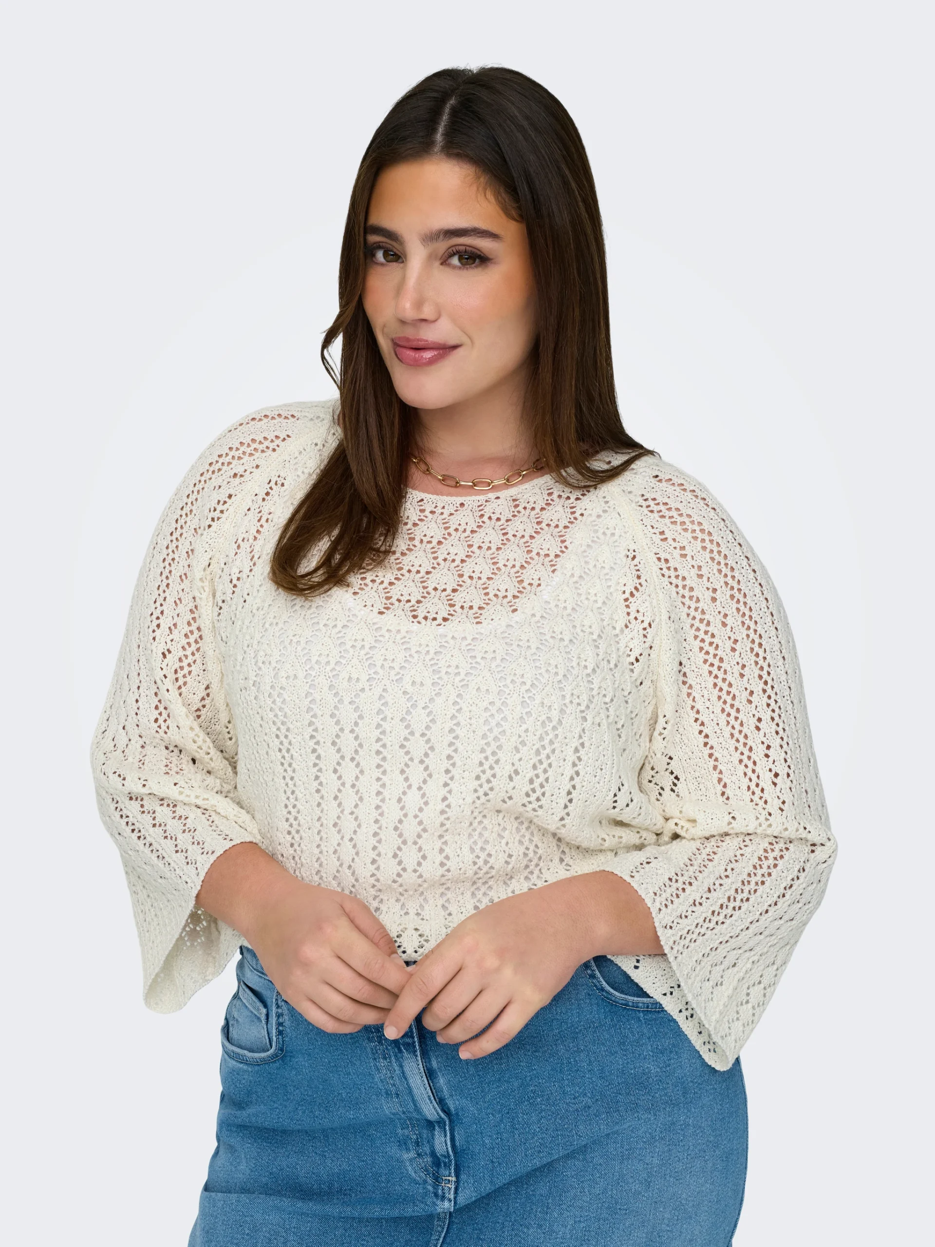 Pullover, tom cru. Malha trabalhada e perfurada. Manga a 3/4 ligeiramente mais larga ao nível do punho. Decote redondo.