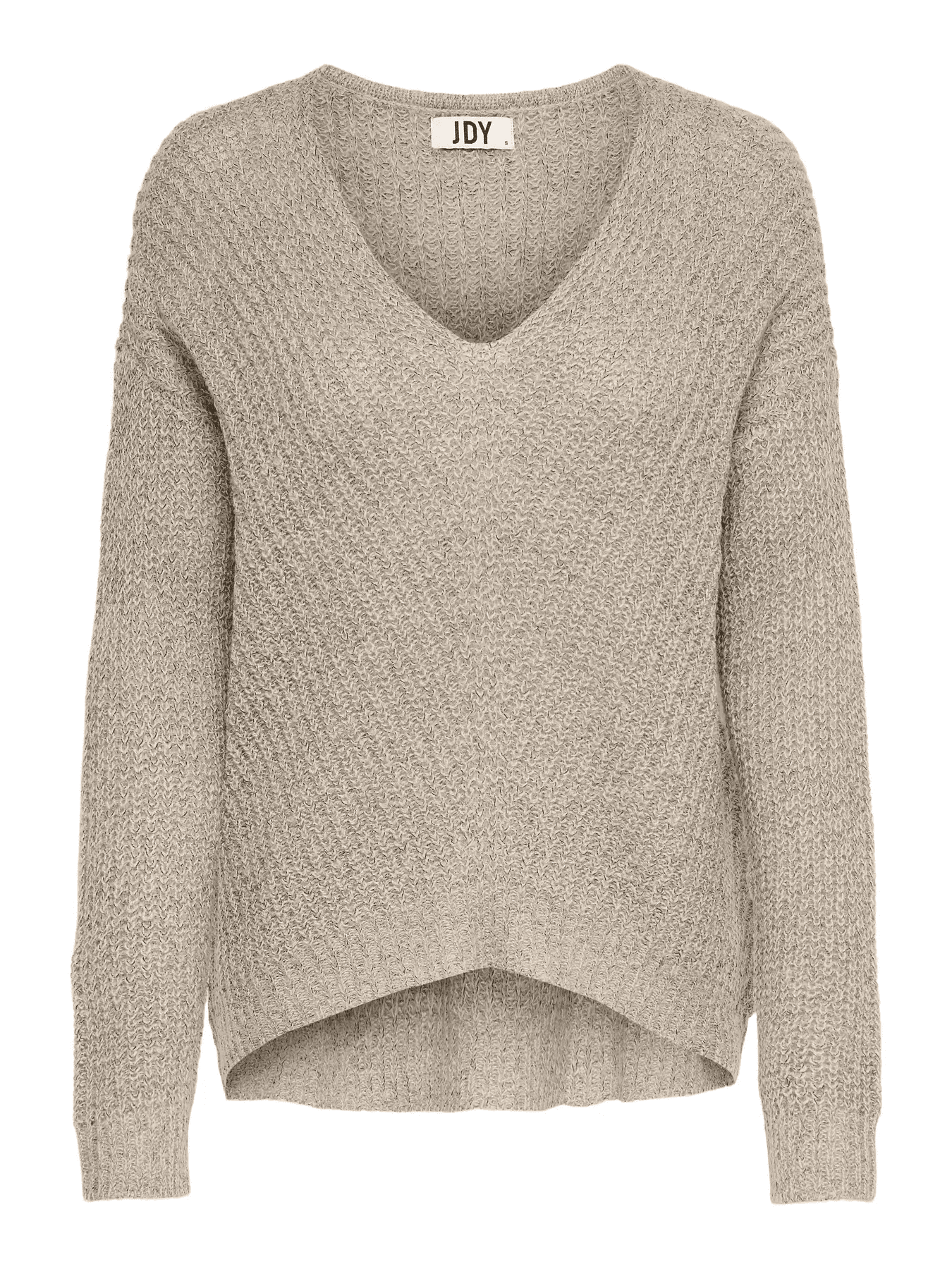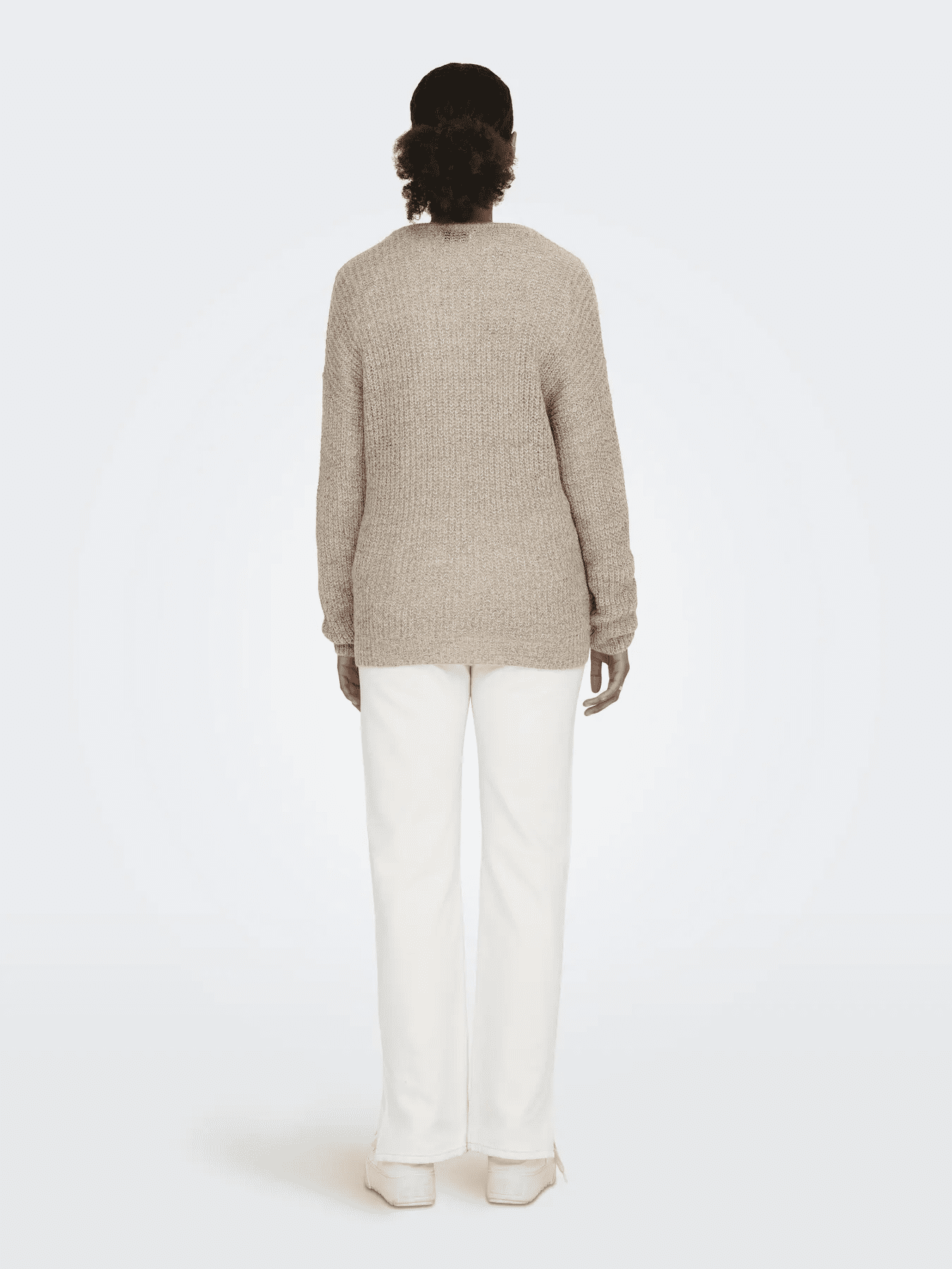 Camisola de malha, na cor areia, de manga comprida e decote em V. Ligeiramente assimétrica.
