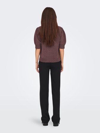 Camisola de malha, muito suave ao toque. Tipo t-shirt de manga curta, com nervuras ao nível do ombro. Manga ligeiramente abalonada. Decote redondo.