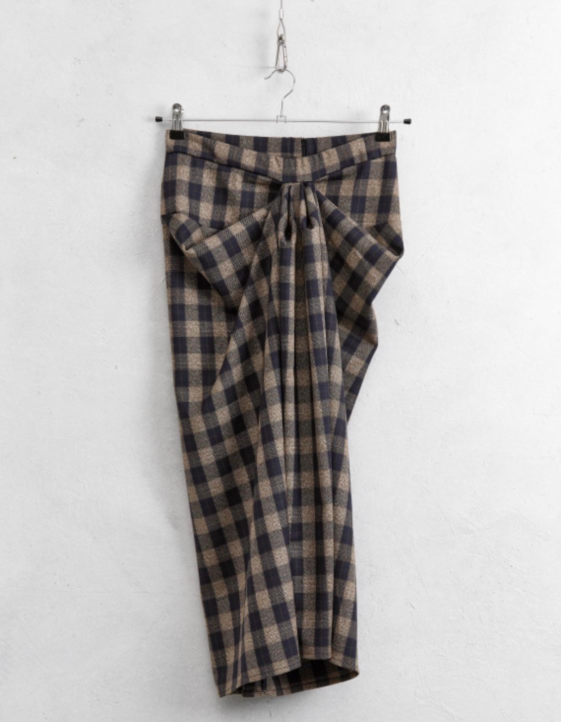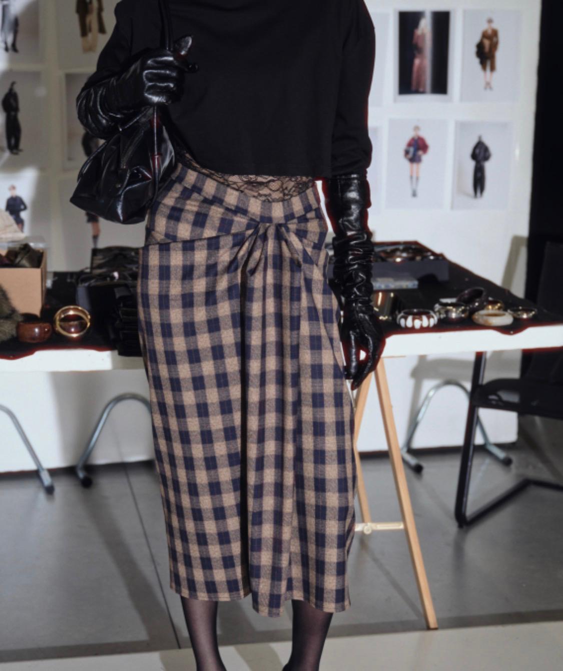 Saia comprida, de corte ajustado (sem colar), em padrão xadrez (azul, castanho e bege). Fecha atrás com fecho invisível. Tem elástico na cintura para melhor ajuste.