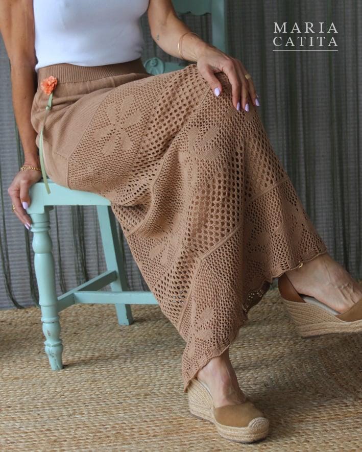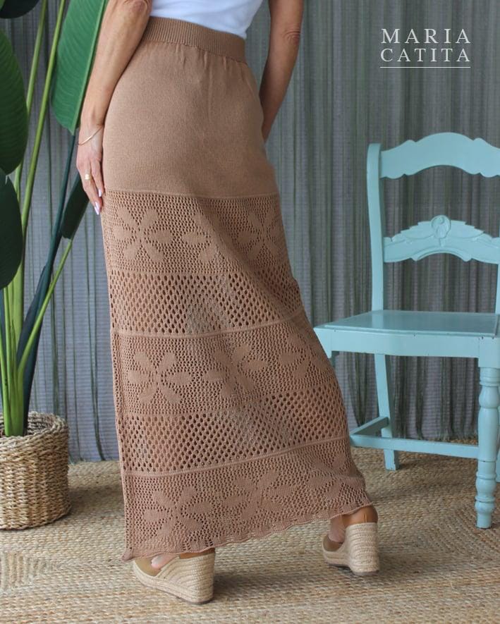 Saia comprida, em linha castanha com transparências. Cós elástico com detalhe floral laranja.