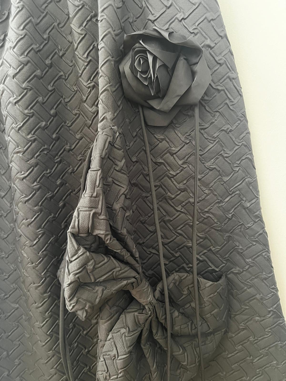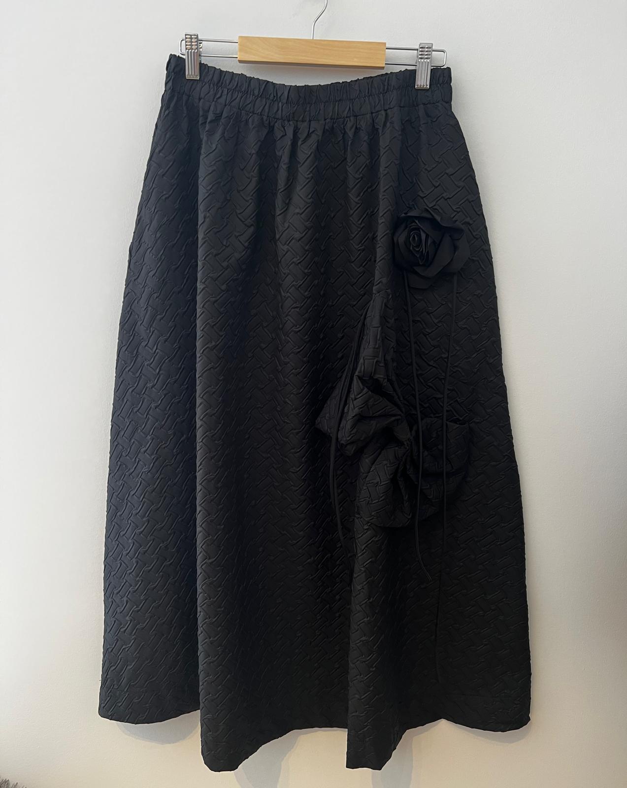 Saia comprida, rodada, em tom preto. Cintura subida, elástica, para melhor ajuste e conforto. O tecido é texturado. Detalhe frontal, de flor e laço no mesmo tecido. Bolsos laterais.