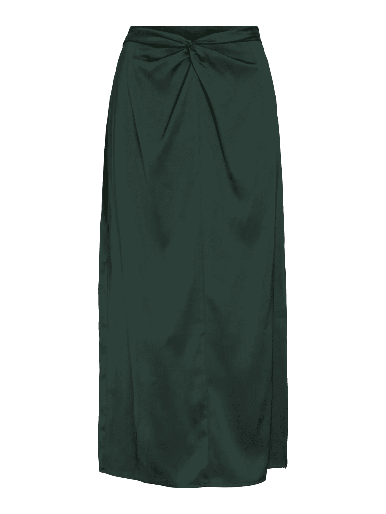 Saia em tecido acetinado verde azulado, de comprimento midi. Detalhe de torcida frontal, o que lhe confere um estilo de elegância major.