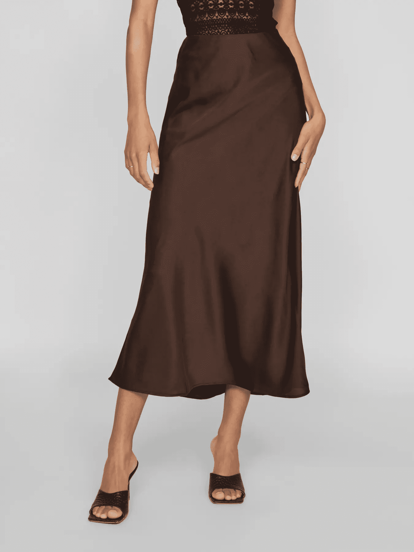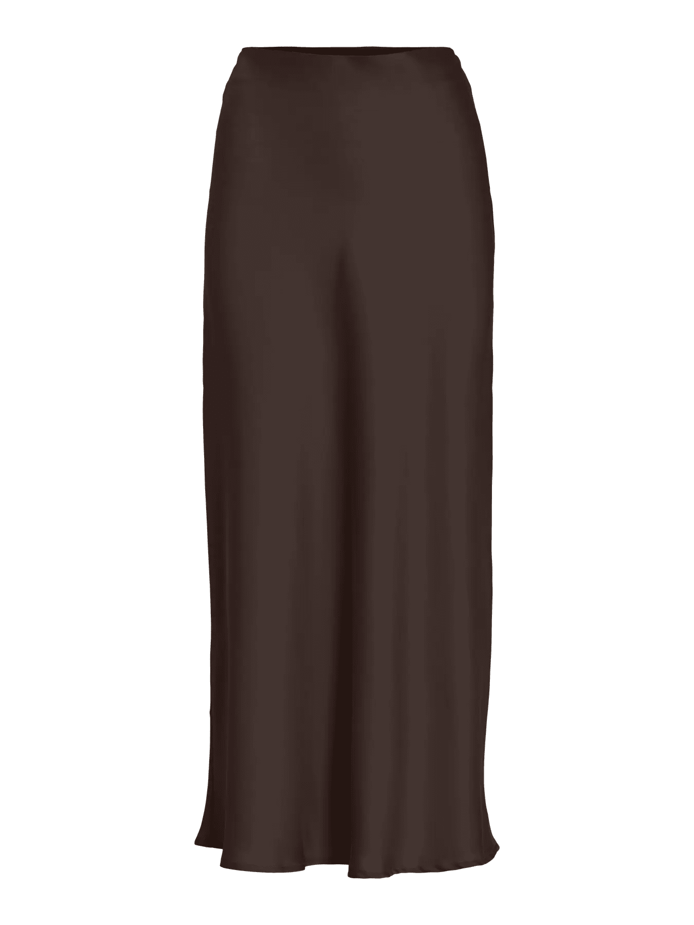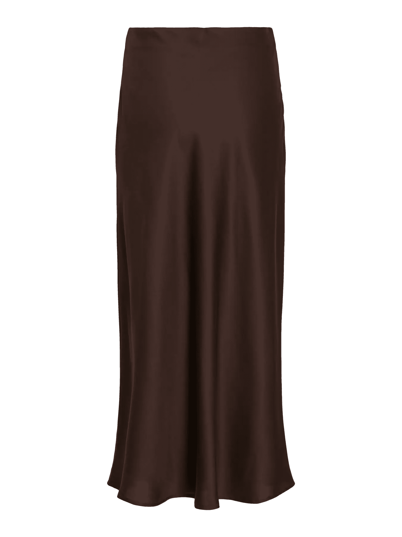 Saia acetinada, comprimento midi/maxi, tom castanho (coffee bean), com elástico na cintura para melhor ajuste.