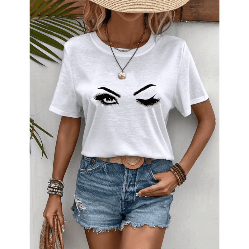 T-shirt de qualidade premium, de manga curta, com gola redonda e estampa de olhos em preto.