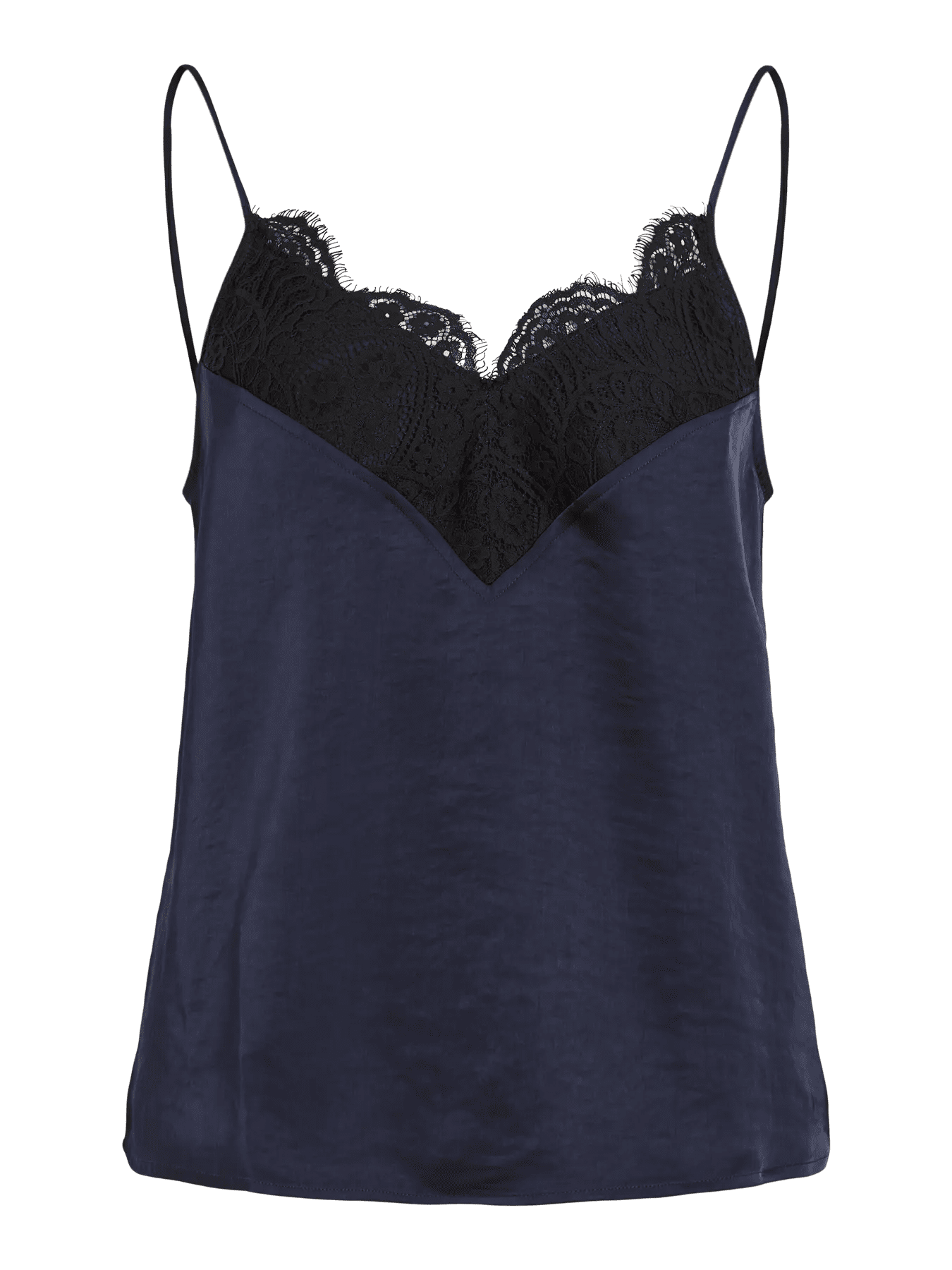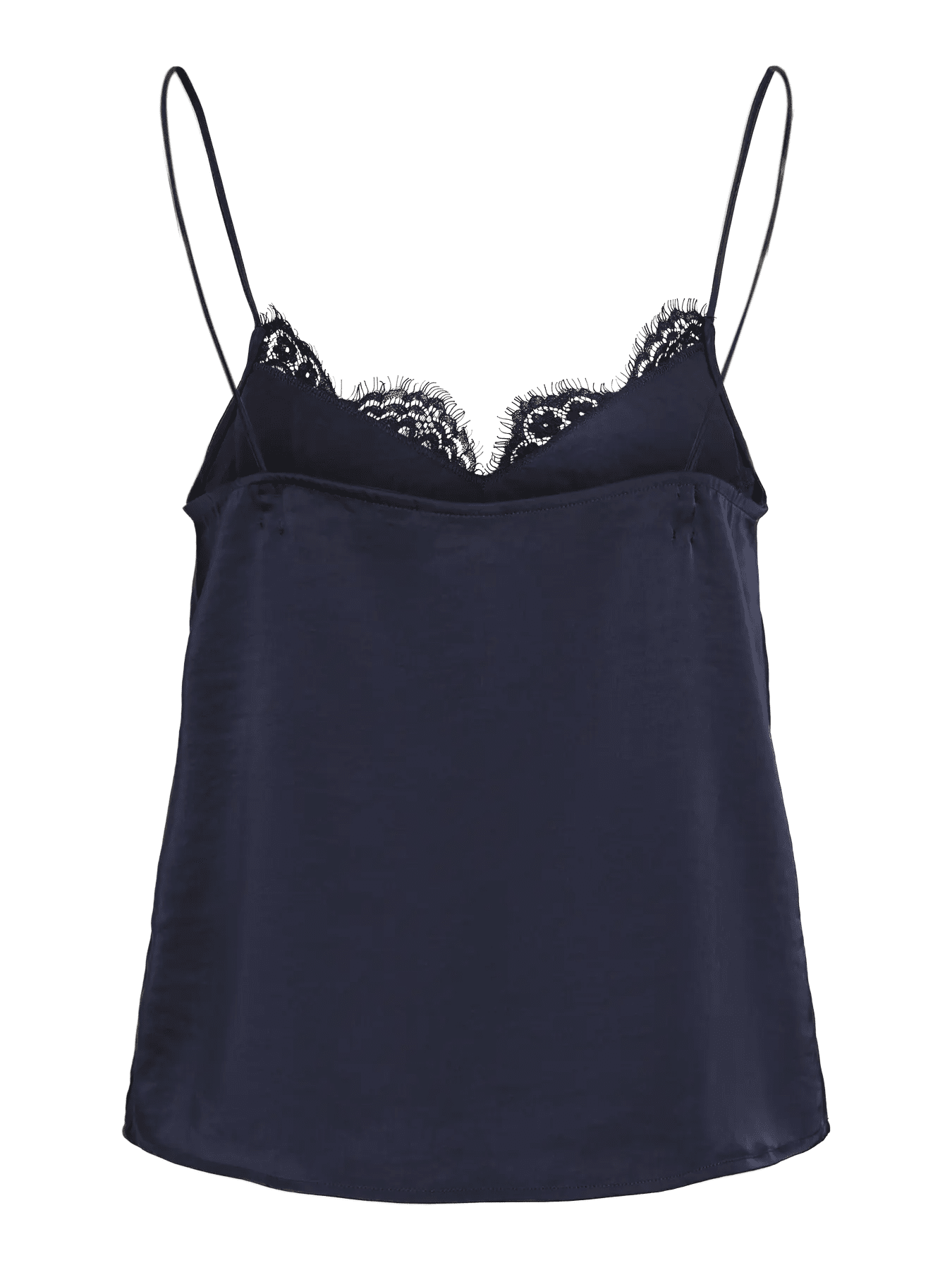 Top de alça fina, acetinado, com renda, em tom azul escuro com renda preta.