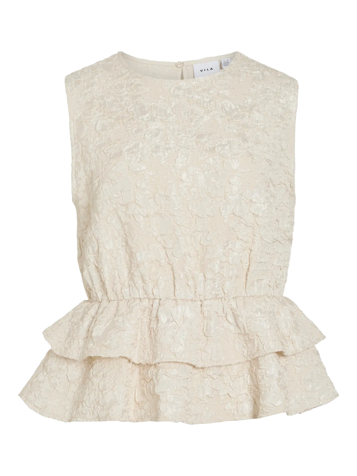 Top estilo peplum, em tecido trabalhado tom cru. Decote subido. Folho a partir da cintura. Comprimento pela anca.
