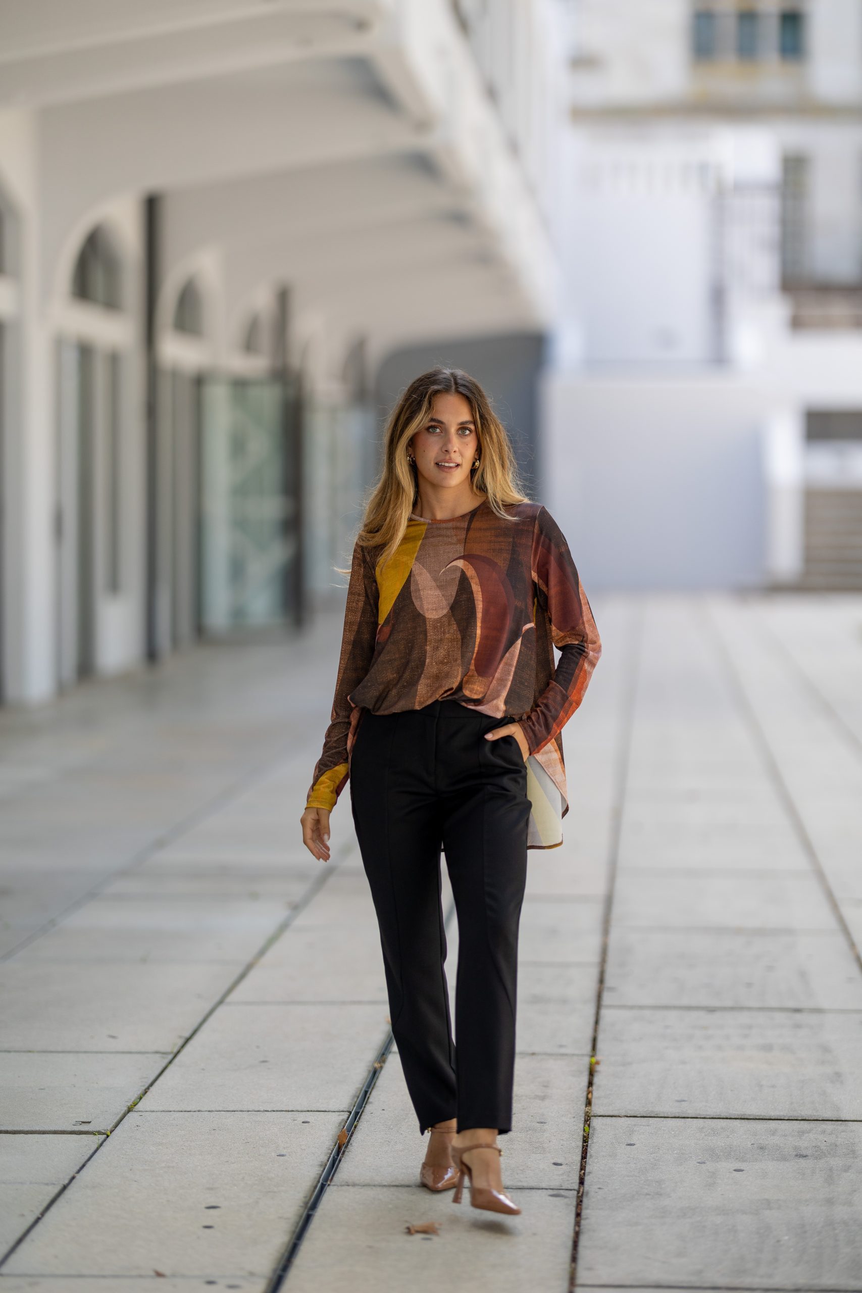 Túnica estampada em tons terra, com manga comprida. Decote redondo.