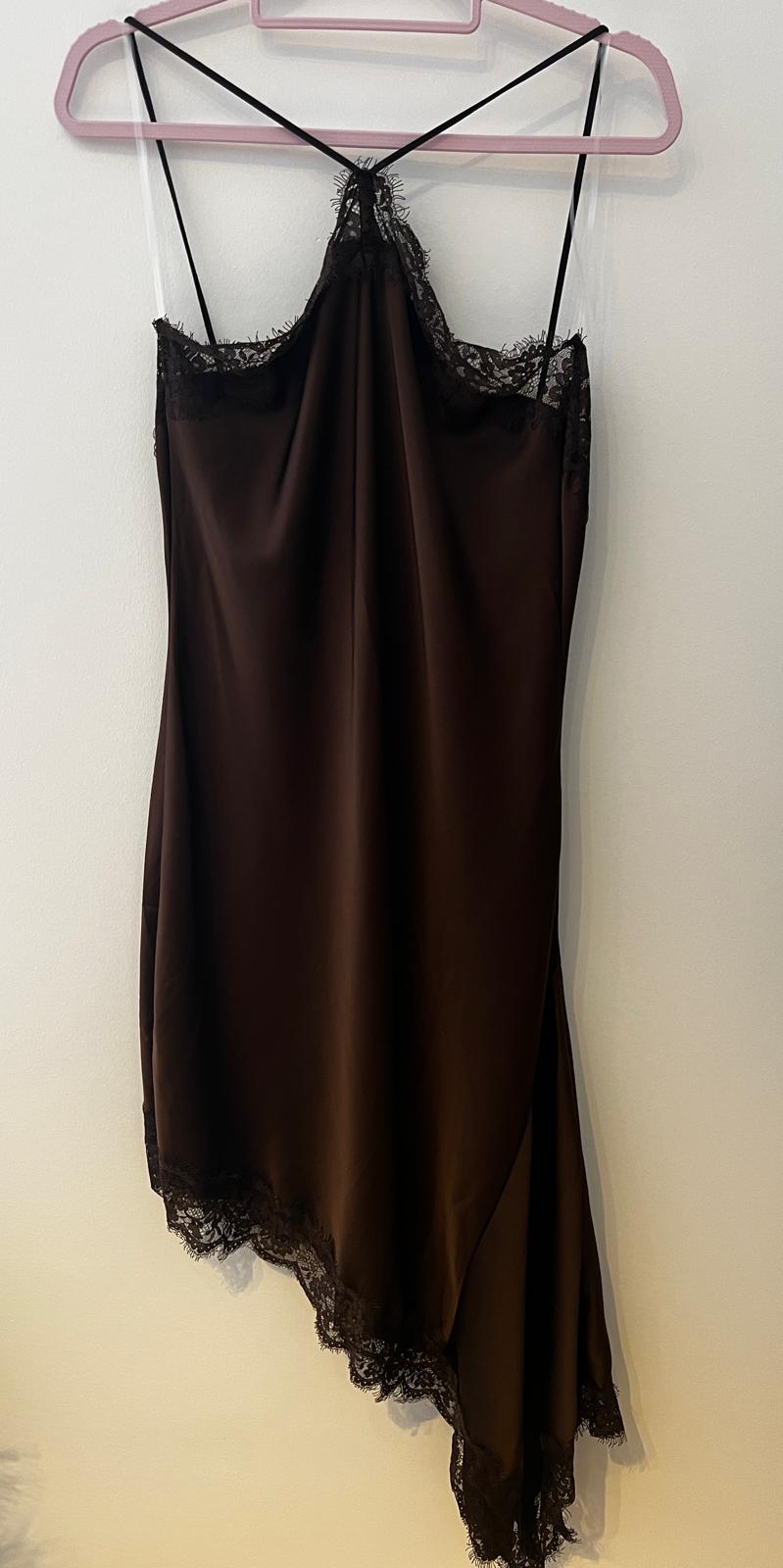 Vestido acetinado, comprido, assimétrico, estilo camisa de noite, com renda na base e em todo o decote frontal, lateral e traseiro. Tom chocolate. Alça muito fina, cruzada no peito e direita nas costas.
