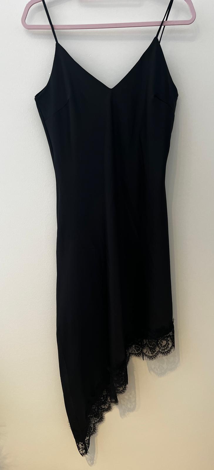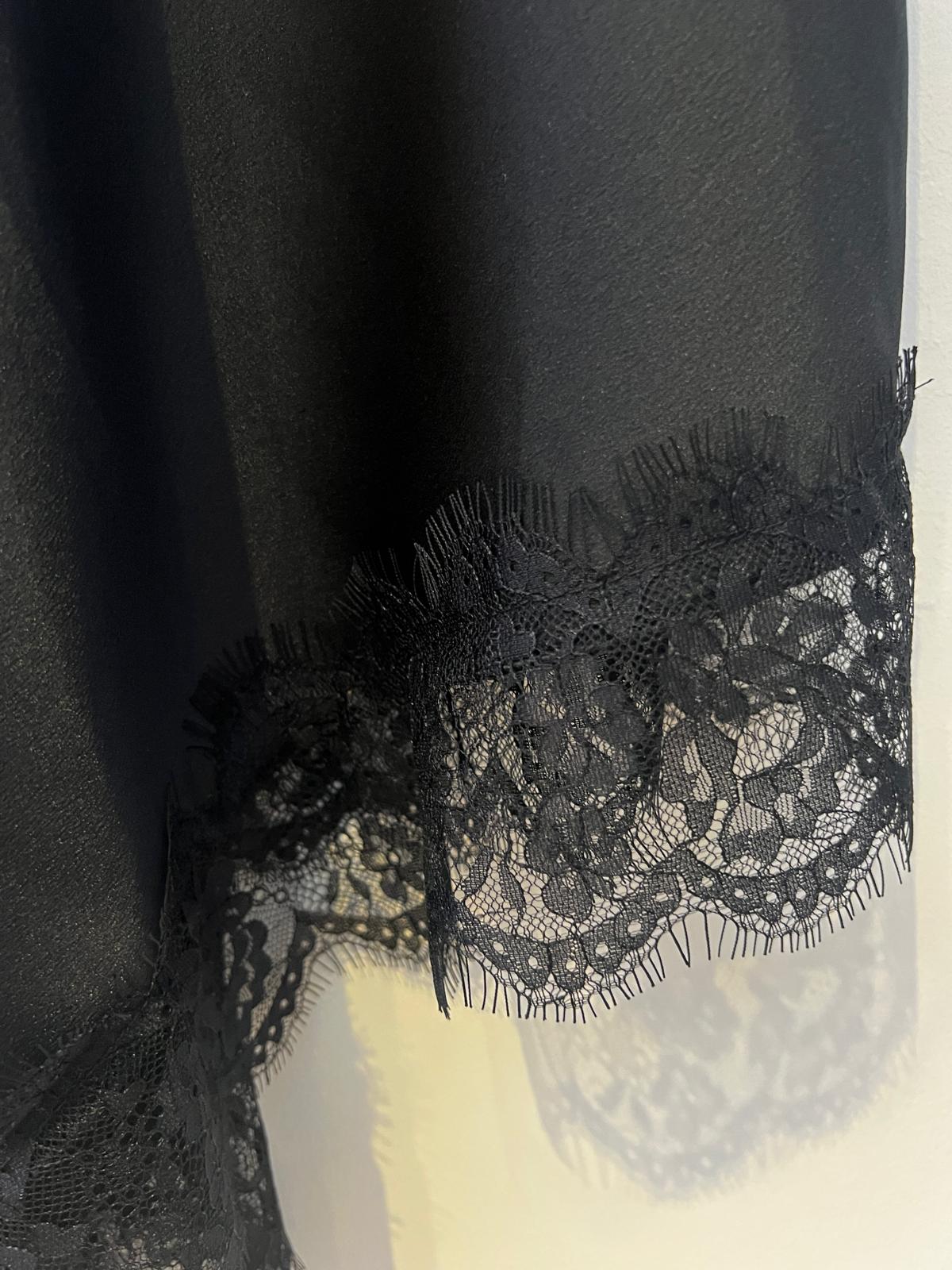 Vestido acetinado, assimétrico, estilo camisa de noite, com renda. Decote em V à frente e atrás, com alça fina. Duplo na zona do peito.