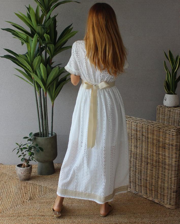 Vestido branco trabalhado, cortado abaixo do peito. Decote em V. Detalhes nas mangas. Racha sobre a perna. Barra trabalhada bege no fundo . Ata atrás com fita bege. Peito e saia forrados.