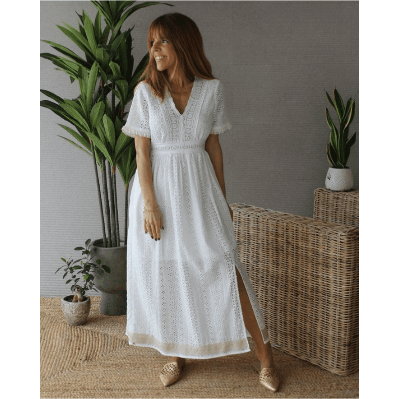 VESTIDO COMPRIDO BRANCO COM RACHA E DETALHES MARIA CATITA – TAM U