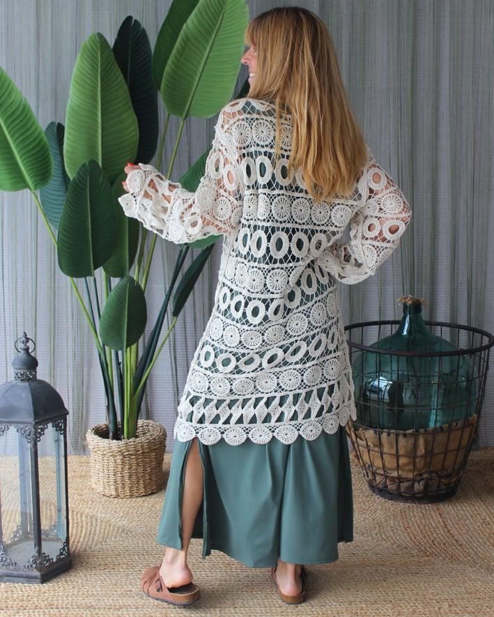 Vestido duplo, composto por um vestido verde de cavas com racha lateral e por outro, para colocar por cima ou para usar sozinho, de algodão rendado.