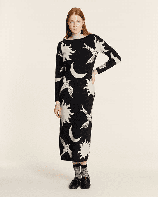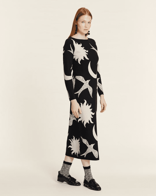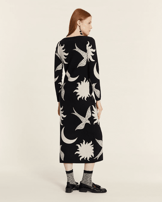 Vestido comprido, de manga comprida e decote à barco, em malhinha muito suave ao toque. Fundo preto com sol e lua desenhados a cru.