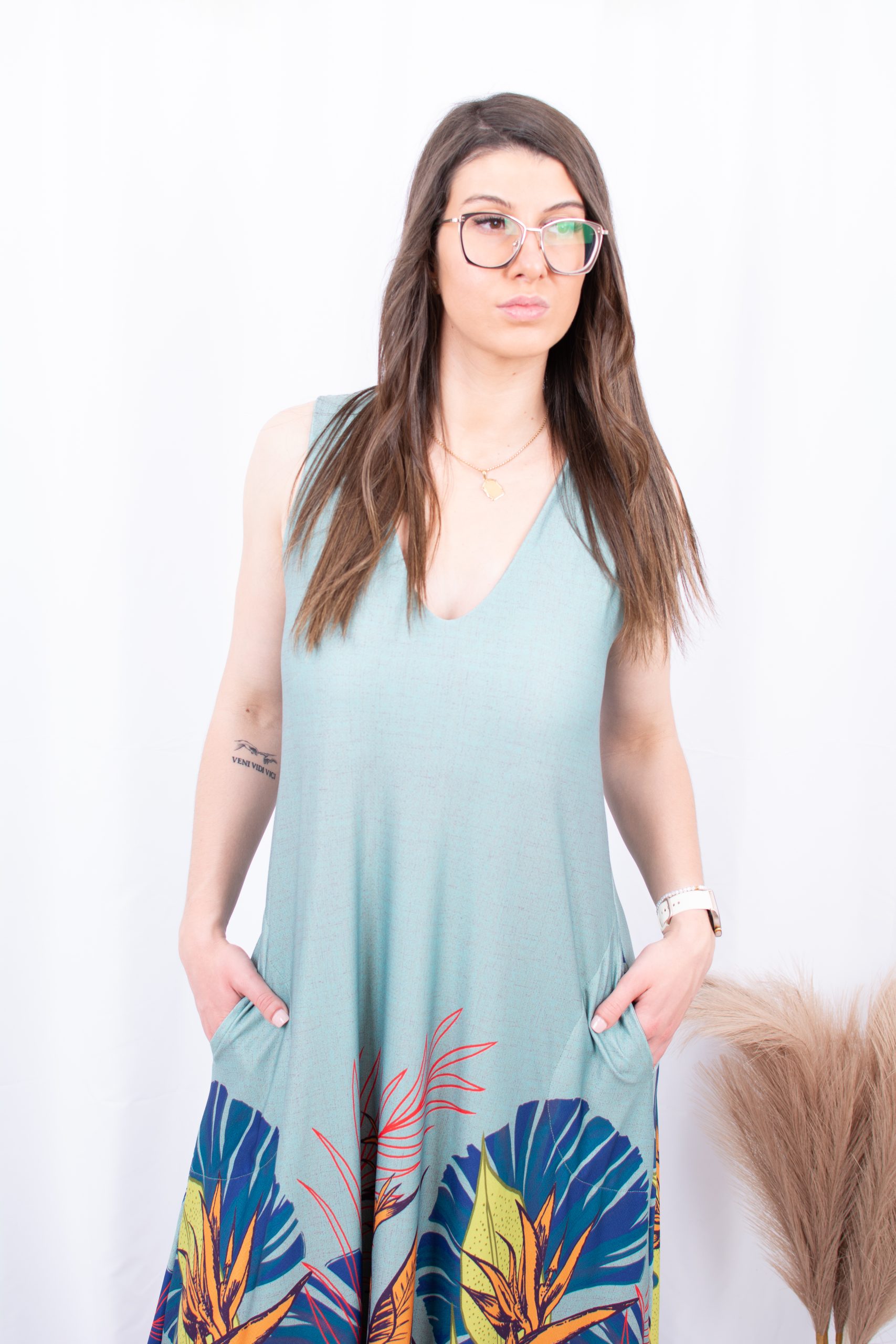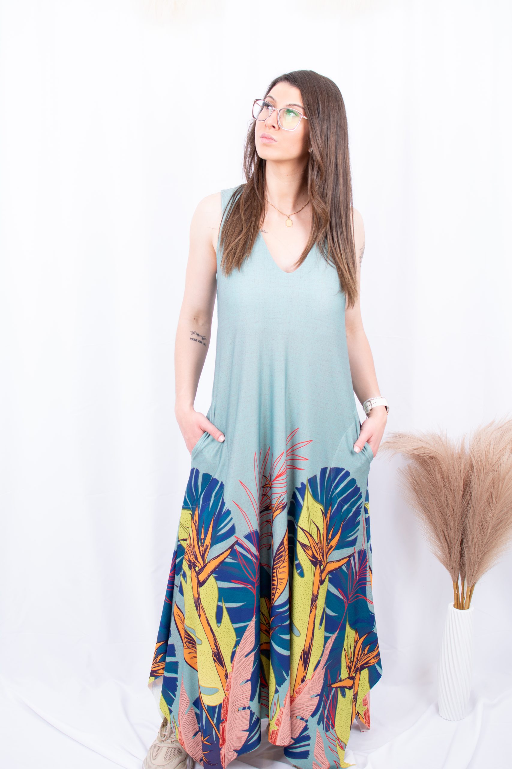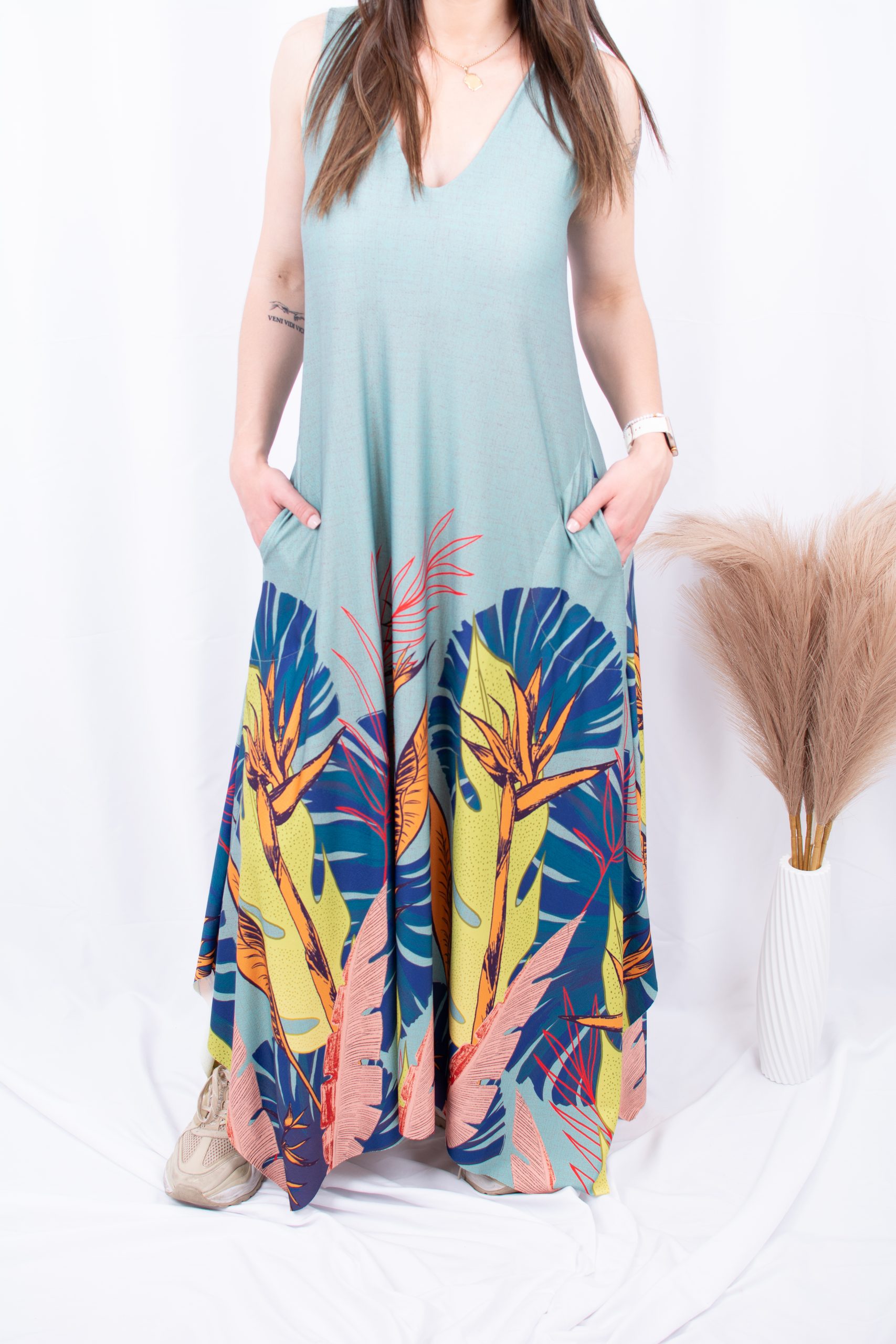 Vestido longo, decote em V com bolsos laterais.