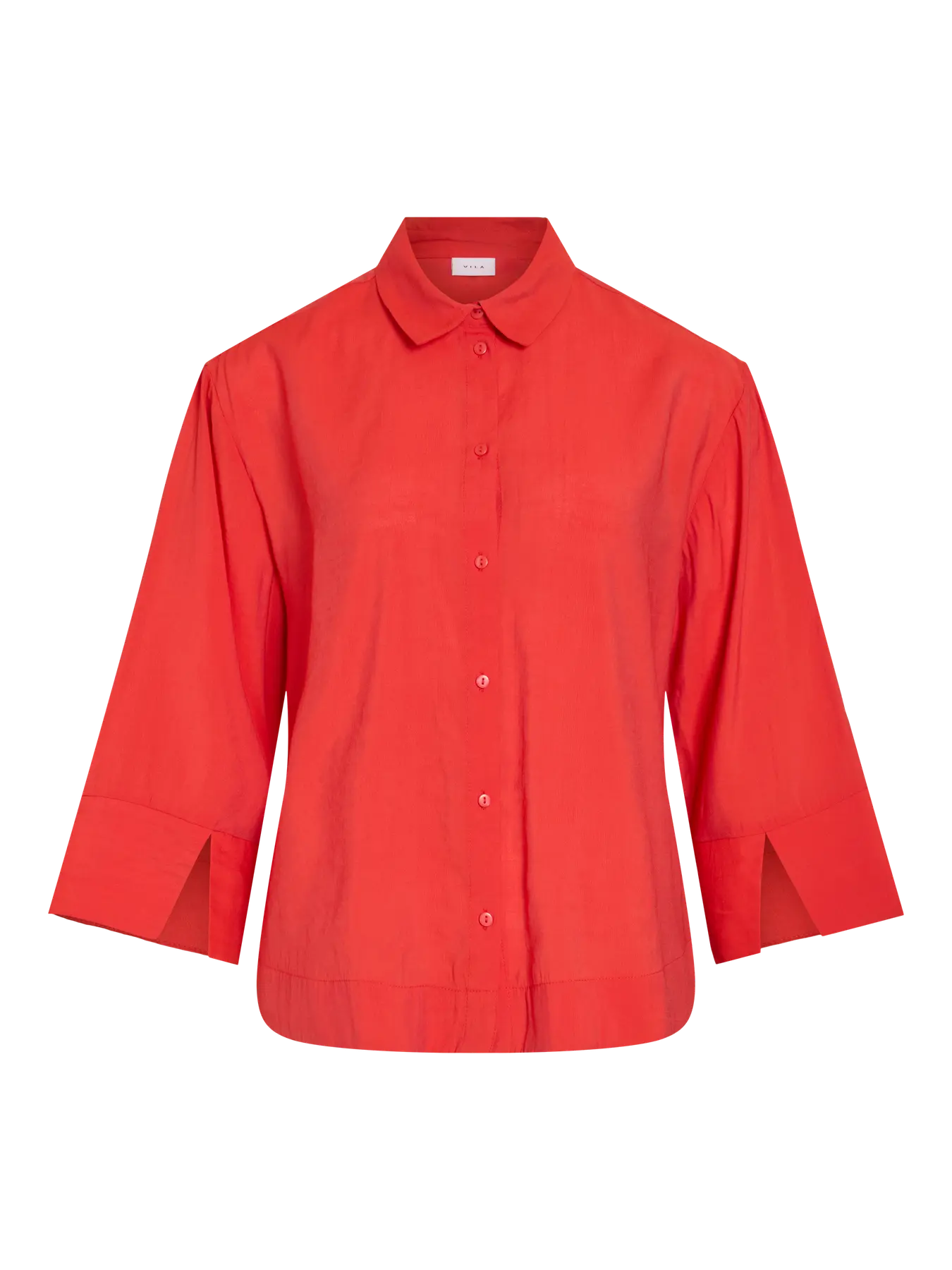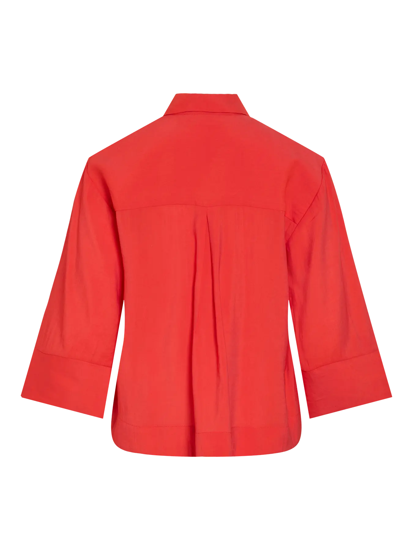 Blusa estilo camisa, em tom hibiscus, em tecido extremamente suave e fresco. Tem gola de camisa e abotoa à frente. É ligeiramente arredondada dos lados e tem manga a 3/4, solta e fluída com racha no punho.