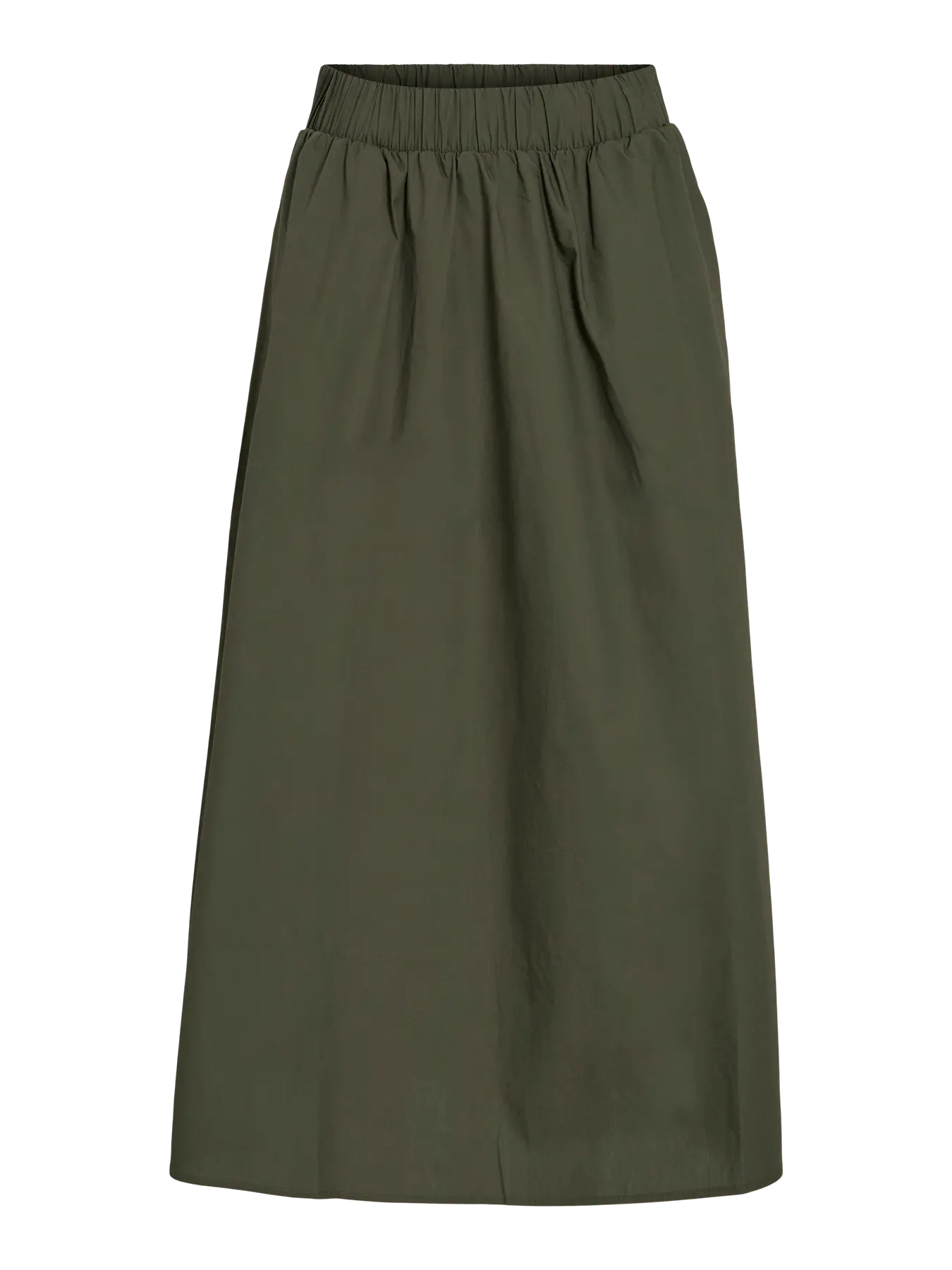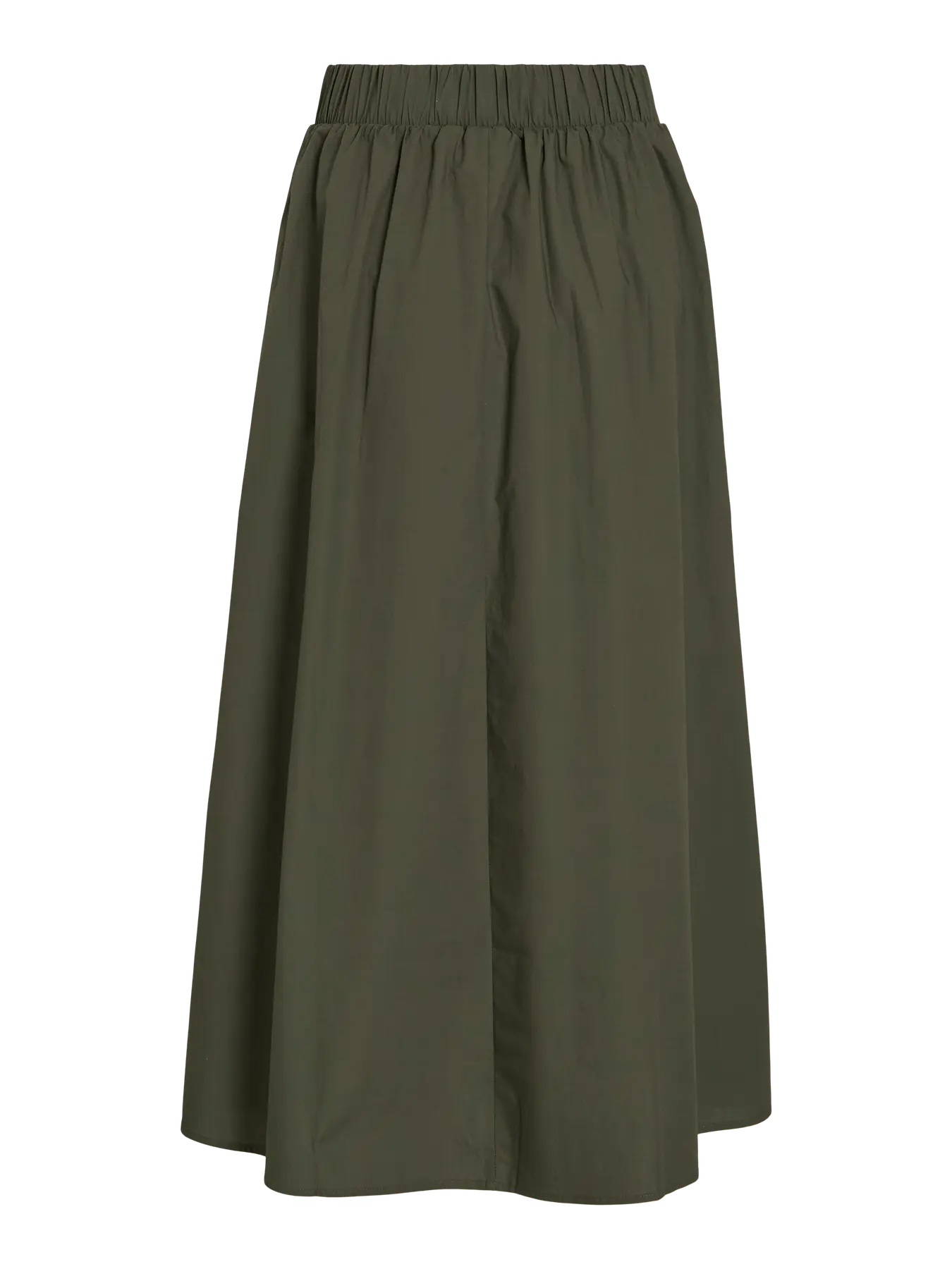 Saia em tom verde oliva, num tecido 100% algodão ligeiramente acetinado. Comprimento midi. Cintura subida, elástica para melhor ajuste e conforto. Bolsos laterais.