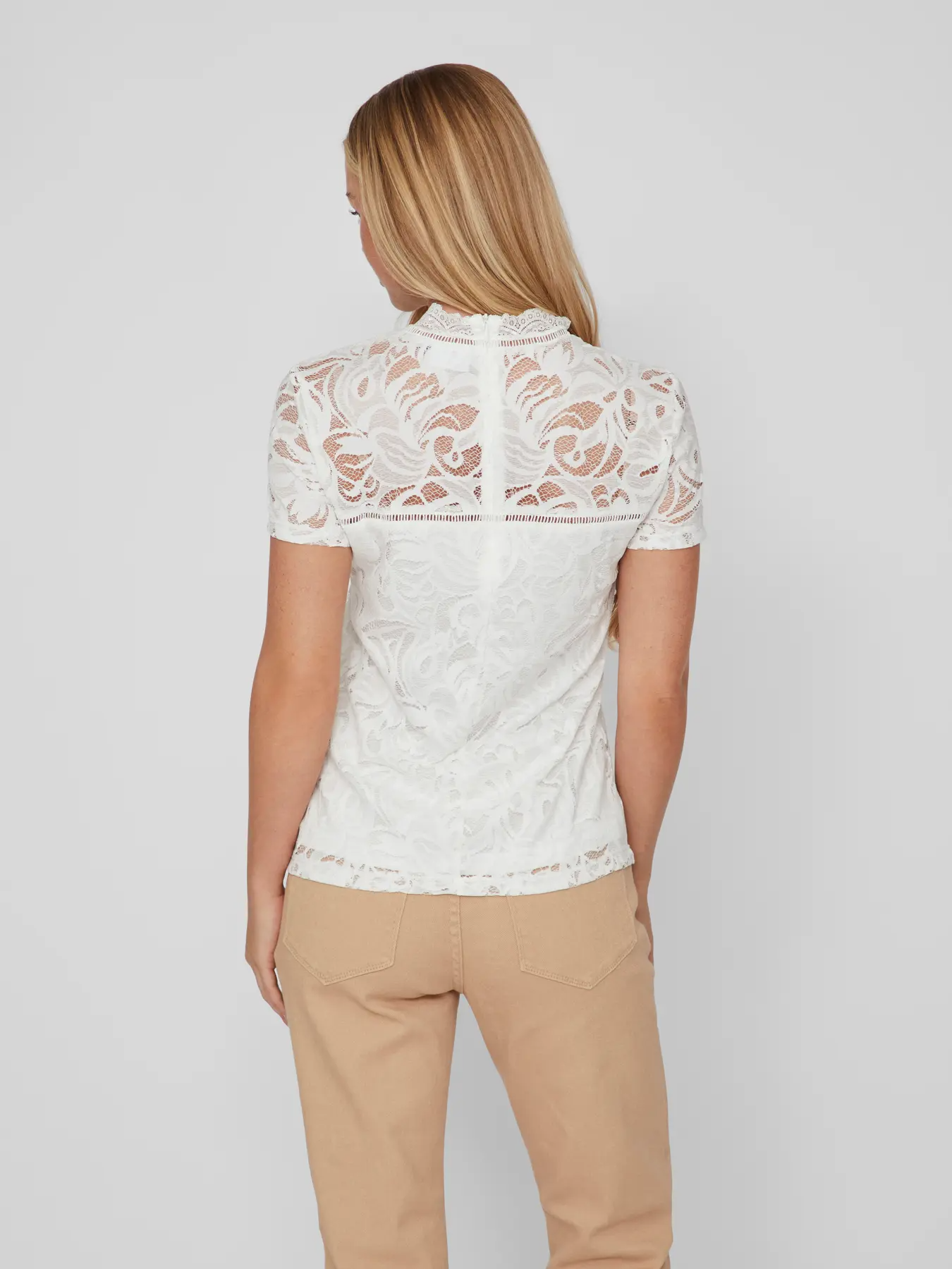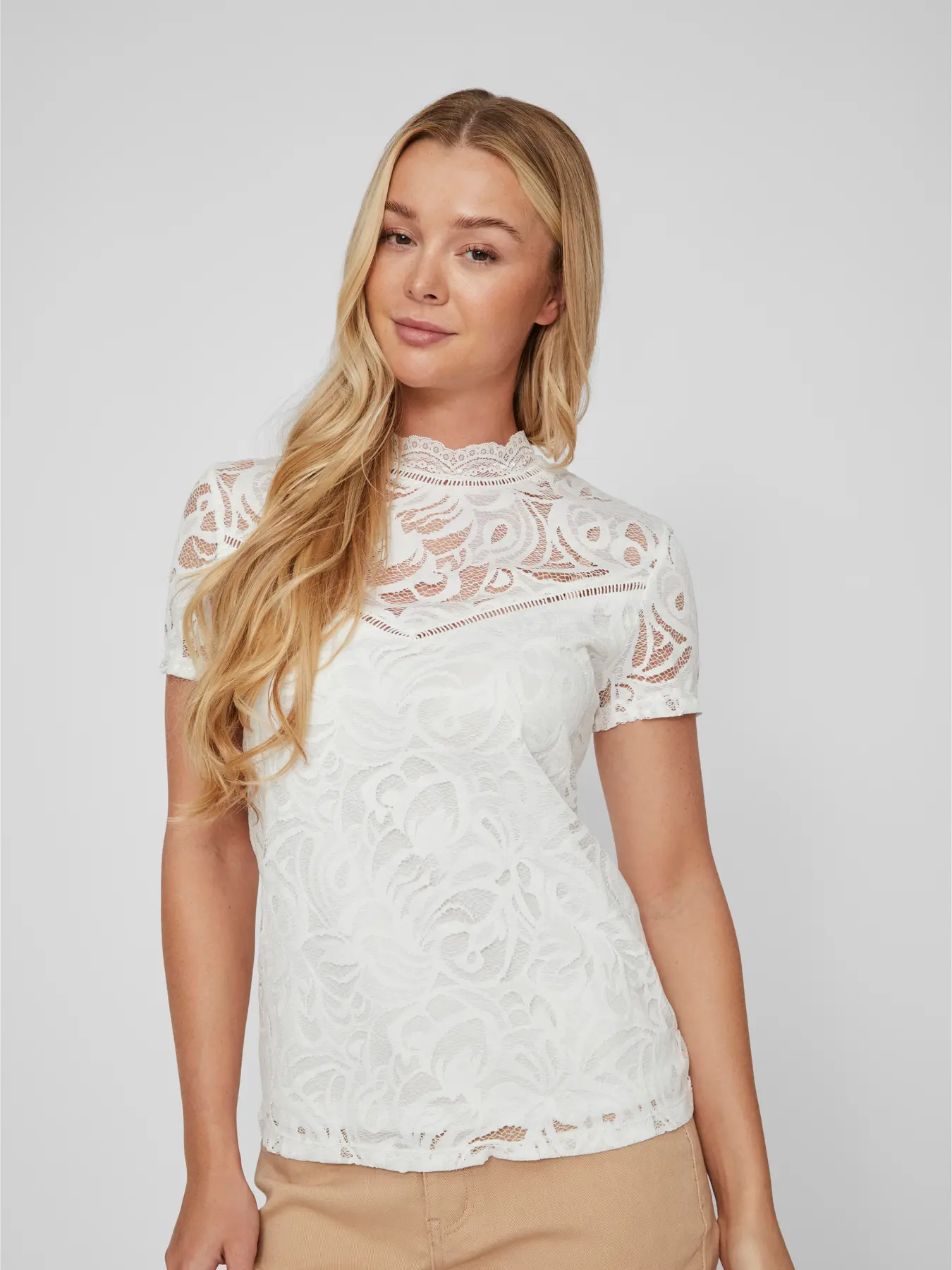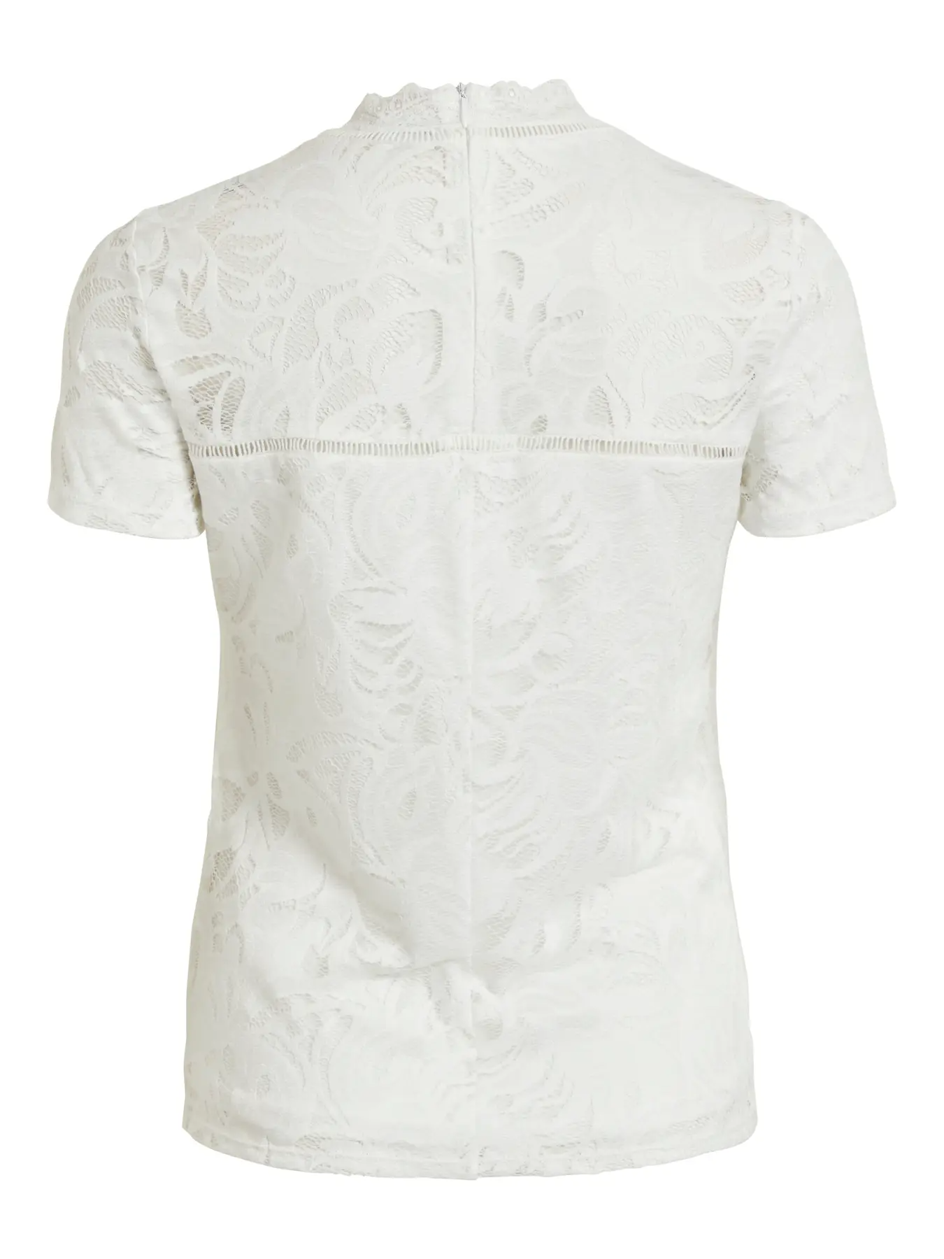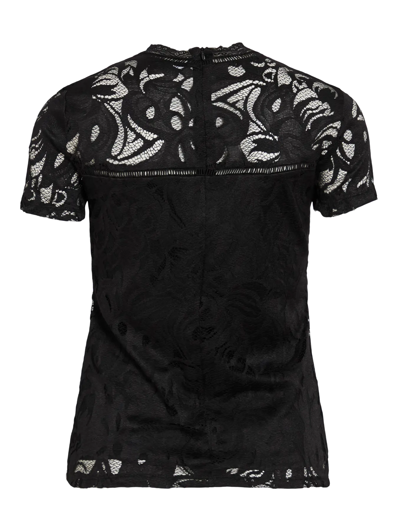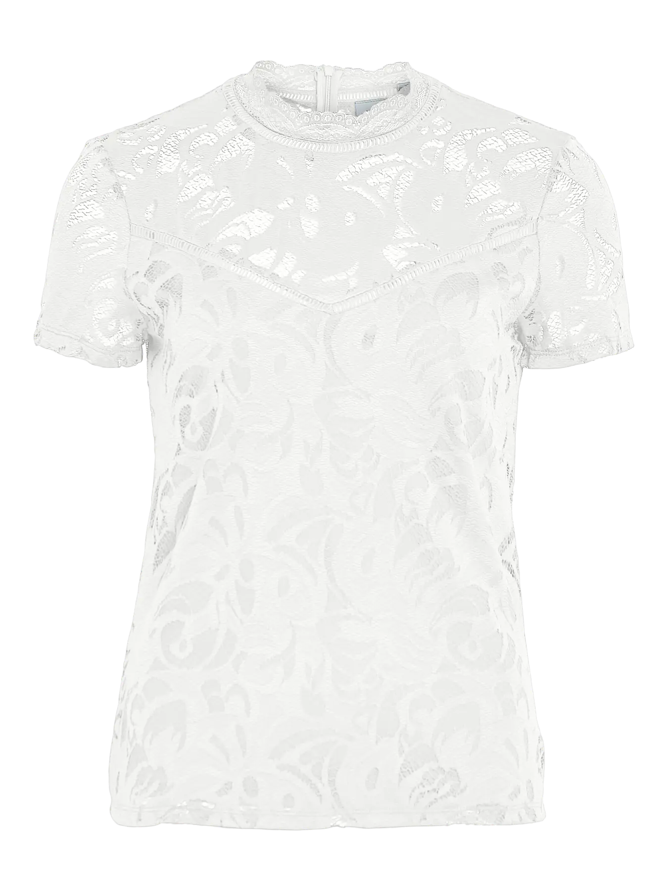 Blusa de manga curta, toda rendada, forrada, mas com transparências no peito, nas costas e nas mangas. O decote é subido, com fecho invisível no pescoço (atrás).